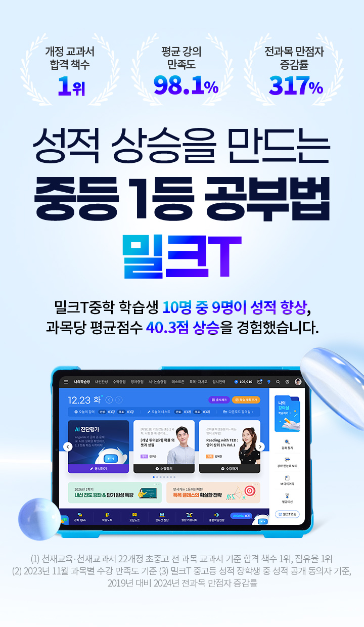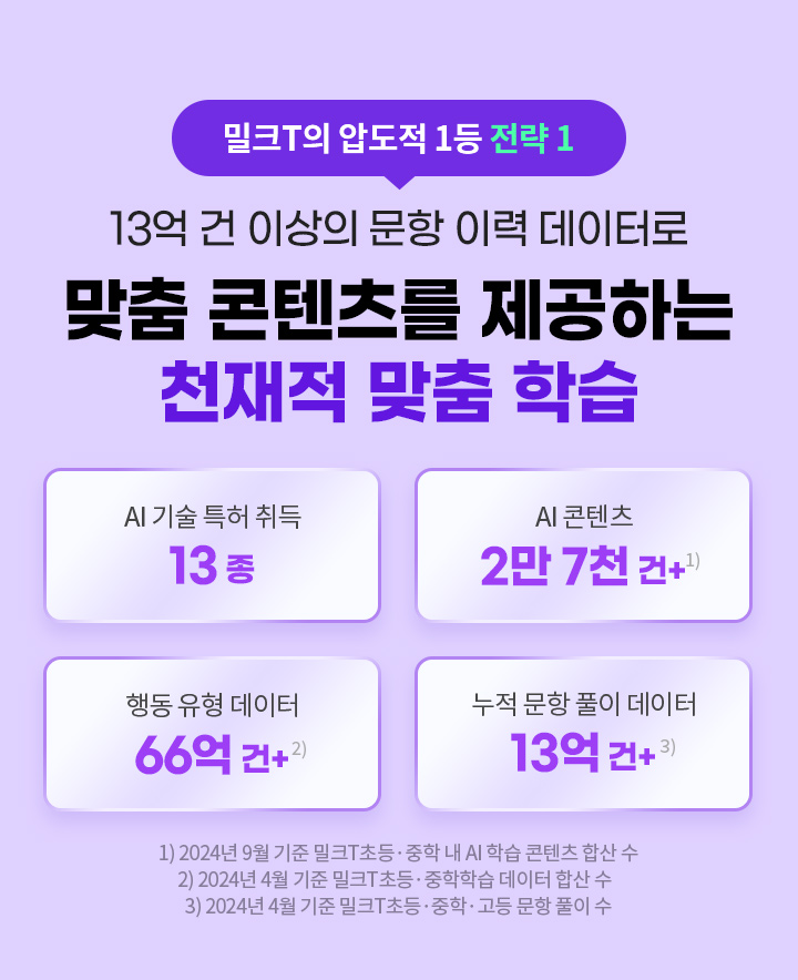 (1) 천재교육·천재교과서 22개정 초중고 전 과목 교과서 기준 합격 책수 1위, 점유율 1위 (2) 2023년 11월 과목별 수강 만족도 기준 (3) 밀크T 중고등 성적 장학생 중 성적 공개 동의자 기준, 2019년 대비 2024년 전과목 만점자 증감률