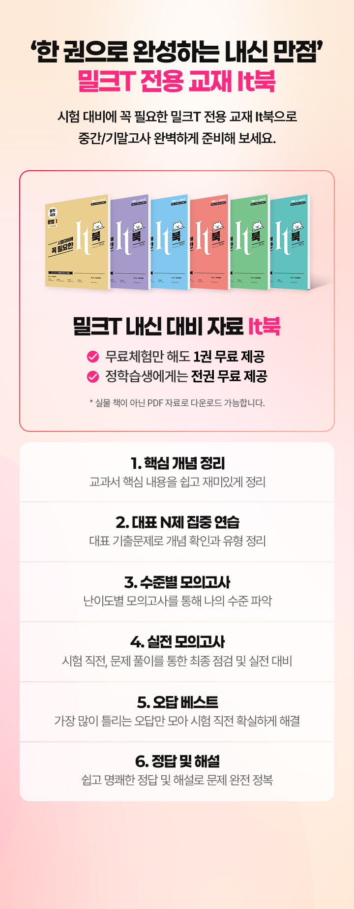 시험 대비에 꼭 필요한 밀크T 전용 교재 It북으로 중간/기말고사 완벽하게 준비해 보세요.